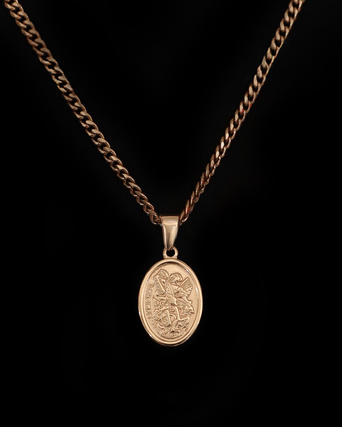 This St. Michael pendant necklace embodies strength, courage, and divine protection. Expertly crafted with intricate detailing, it depicts St. Michael the Archangel triumphing over evil — a timeless symbol of faith and resilience. Framed in a radiant finish, this pendant serves as both a statement of style and a powerful reminder of spiritual guardianship. Perfect for those who carry courage and conviction close to their heart.